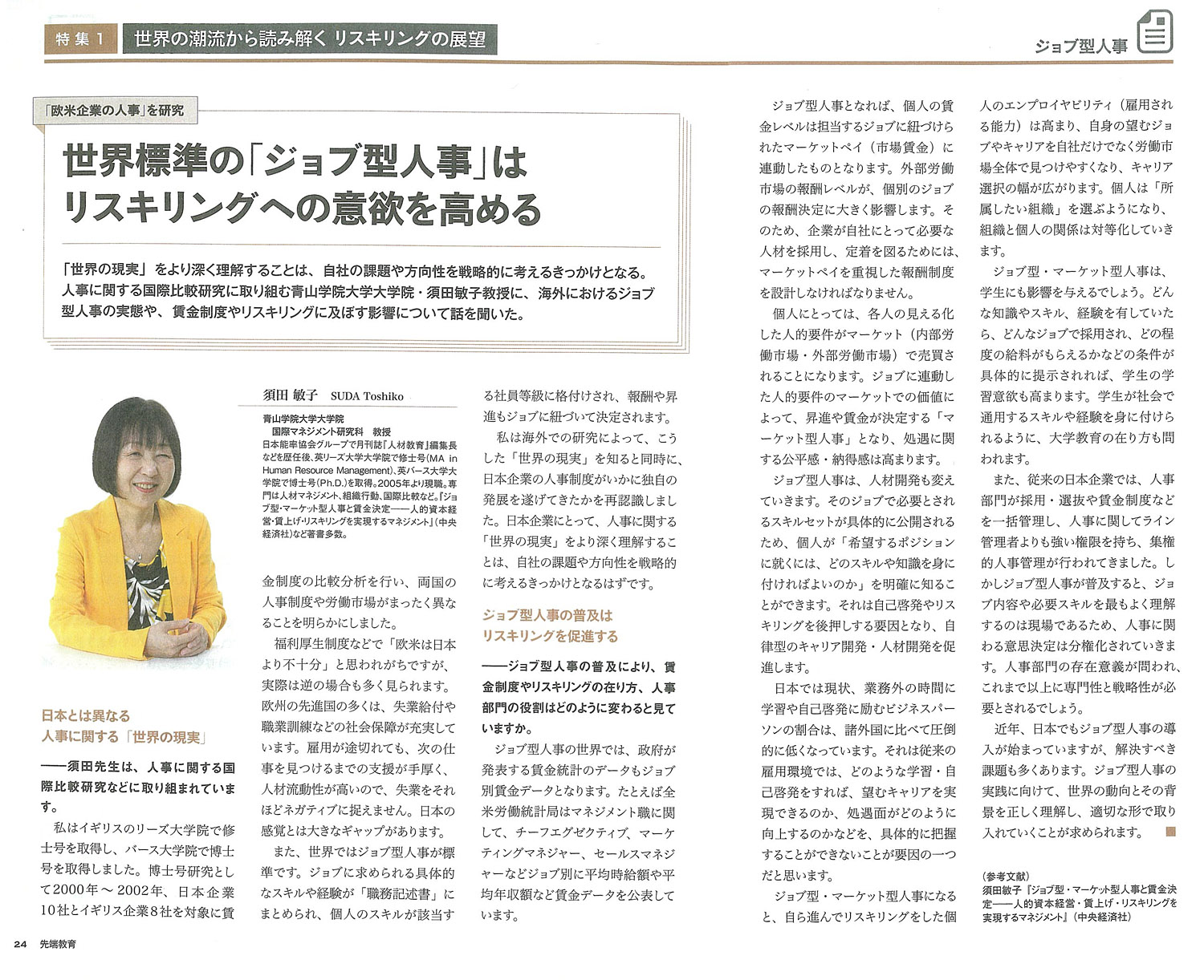 須田教授のインタビュー記事は、2025年6月号の特集記事「世界の潮流から読み解くリスキリングの展望」に掲載されており、内容は須田教授の近年の研究テーマである世界標準のジョブ型人事によってどのようにリスキリングが促進されるかについて語ったものです。